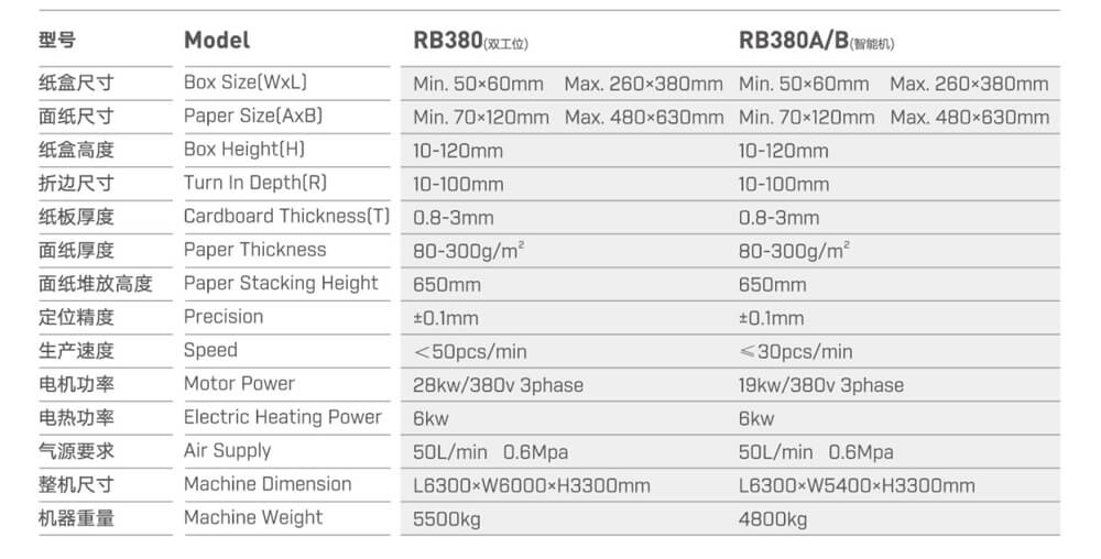 应用范围广: RB380可以生产各种类型的盒子,包括礼品盒、鞋盒、化妆品盒等,因此适合在许多不同行业使用。